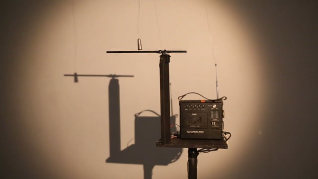 The movement of the pendulums between two different sounds creates radio disturbances. Similarly, the movement of visitors in the gallery also contributes to the formation of radio disturbances that are heard through the receiver. The sounds that are heard are the transition sounds between two frequencies – a product of disturbance, a sound that exists but its source is hidden.